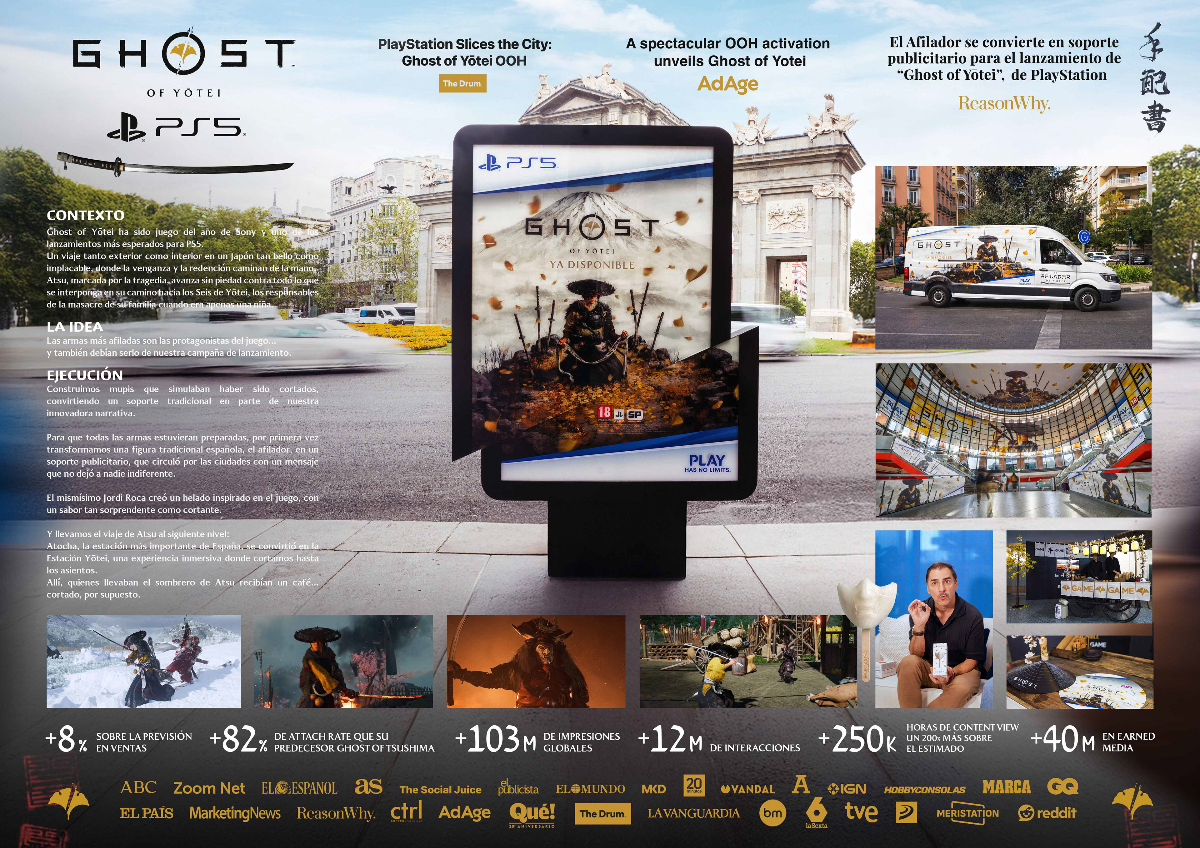 “Ghost of Yotei” es el lanzamiento más esperado de la comunidad mundial de PlayStation en 2025. Ambientado 300 años después del éxito de crítica Ghost of Tsushima, Ghost of Yotei es una experiencia independiente situada en el Japón rural del siglo XVII. La historia sigue a una mercenaria atormentada y solitaria llamada Atsu. Sedienta de venganza, recorre los bellos e inhóspitos paisajes del norte de Japón para dar caza a los que mataron a su familia muchos años atrás. Dieciséis años después de la muerte de su familia, el periplo de Atsu por todo Ezo la lleva a tierras inexploradas en busca de una banda de seis forajidos, pero encuentra mucho más que la simple venganza. Durante su viaje por este mundo abierto, Atsu descubrirá aliados inesperados y vínculos mucho más fuertes de lo que podía imaginar. “'Ghost of Yotei': la última joya de PS5 es un 'western' ambientado en el Japón de Kurosawa” - ABC “La nueva epopeya samurái de PlayStation” - El Español “'Ghost of Yotei'. Una estupenda secuela” - El País “'Ghost of Yotei' lo tiene todo para convertirse en un referente de PlayStation” – La Vanguardia “'Ghost of Yotei' un mundo abierto espectacular” - HobbyConsolas Las armas más afiladas son las protagonistas del juego… y también de nuestra campaña de lanzamiento: Construimos mupis que simulaban haber sido cortados, convirtiendo un soporte tradicional en parte de nuestra innovadora narrativa. Para que todas las armas estuvieran preparadas, por primera vez, transformamos una figura tradicional española, el afilador, en un soporte publicitario, que circuló por las ciudades con un mensaje que no dejó a nadie indiferente. El mismísimo Jordi Roca creó un helado inspirado en el juego, con un sabor tan sorprendente como cortante. Y llevamos el viaje de Atsu al siguiente nivel: Atocha, la estación más importante de España, se convirtió en la Estación Yotei con una experiencia inmersiva de gran formato en la que vinilamos toda la cúpula y colocamos bancos que habían sido cortados. Allí, regalamos sombreros kasa-flyers y quienes se lo ponían como Atsu recibían un café… cortado, por supuesto. Una campaña que ha dejado a todo el mundo de una pieza con producción de We Are CP, José Agra, David Coulouscou, Esther García, Juanjo Ocio, Sara Contreras, Victoria Barbeito, Denitsa Georgieva. Dirigida por Antonio Barrantes Alonso “Chusky” con fotografía de Víctor M. Pecellín Martínez.